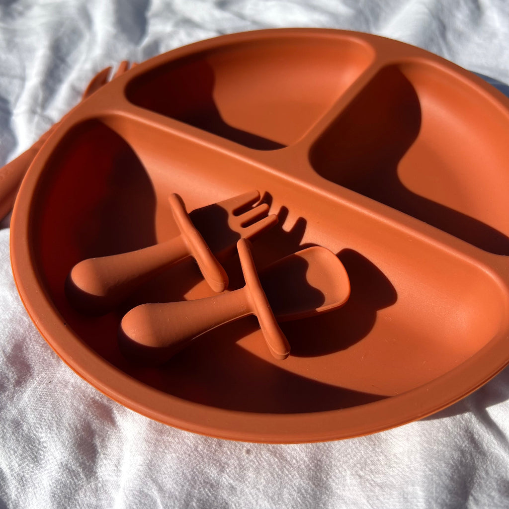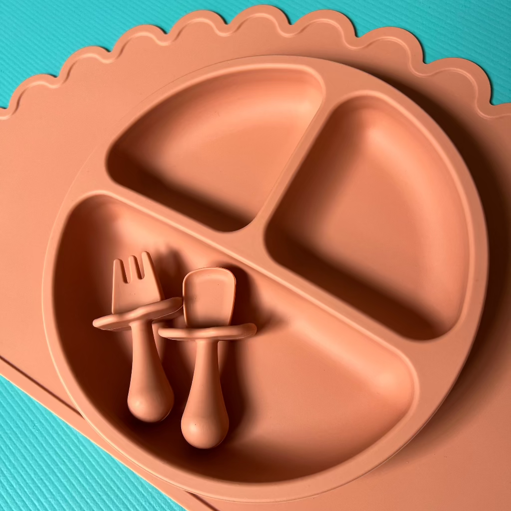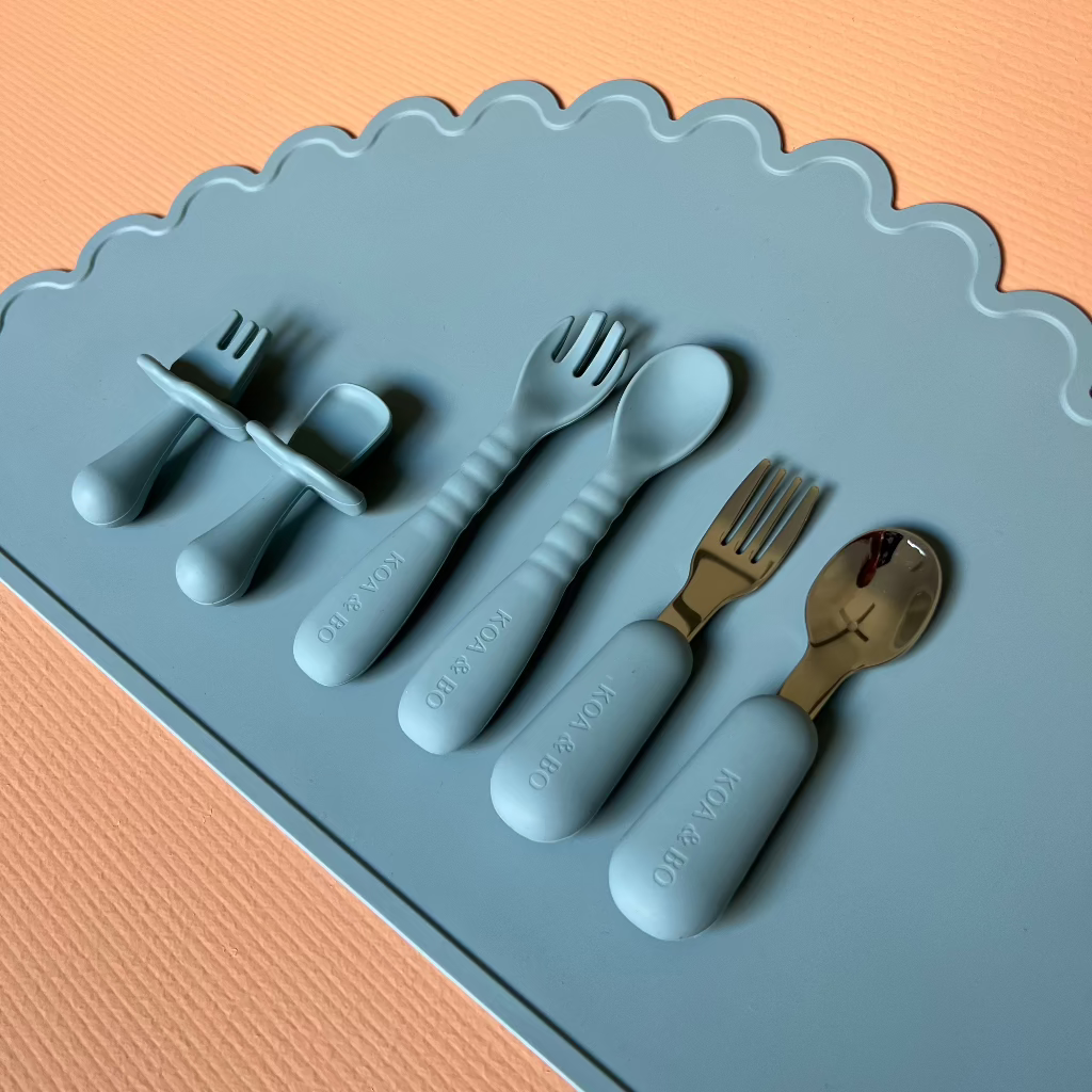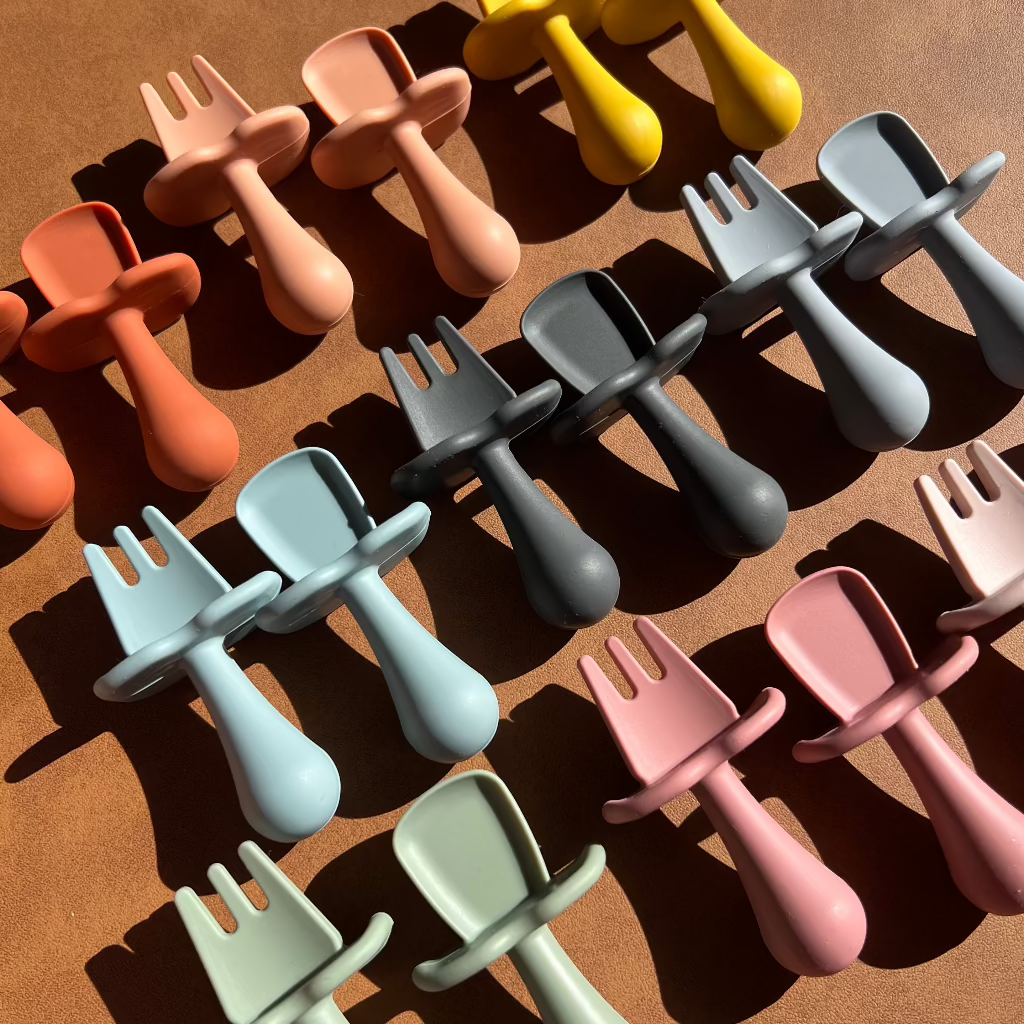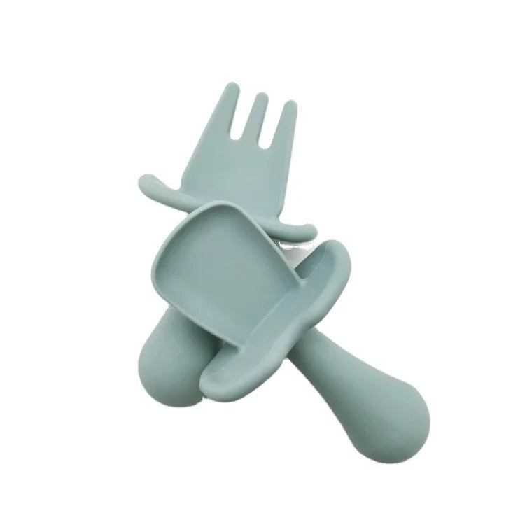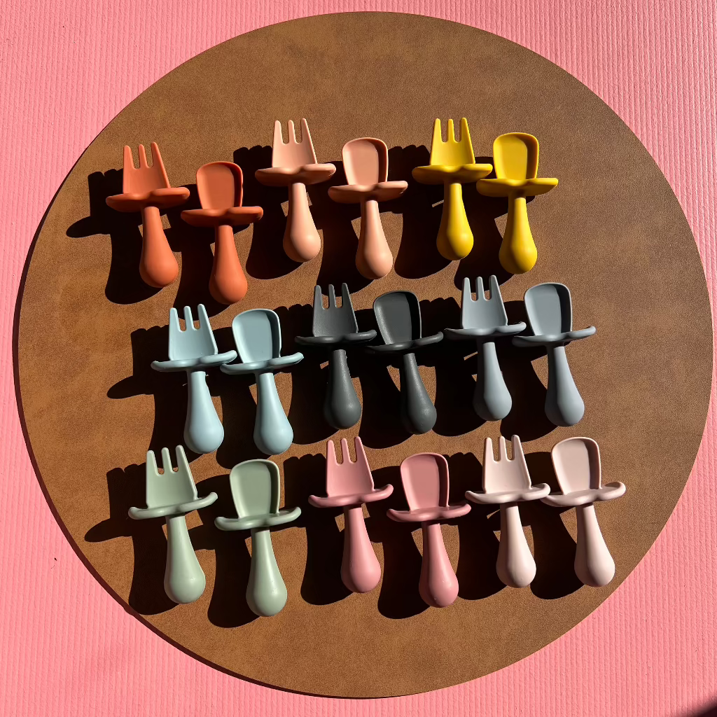 Fork & Spoon. baby led weaning made easy with shorter handles and mouth guard to prevent choking/gagging. Easy to clean and dishwasher safe. Our 100% food grade silicone is soft on your little ones mouth and gums